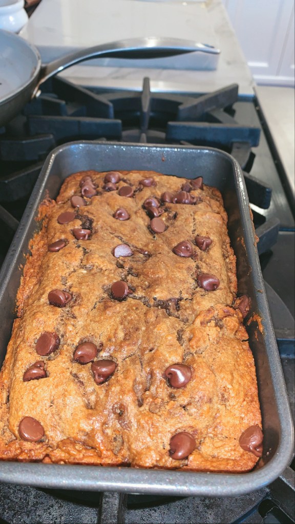 During this quarantine I have really gotten into baking. One of my new favorite things to bake is banana bread. The ingredients to this banana bread are 3 very ripe bananas, ¾ cup of maple syrup, ½ cup of melted coconut oil, 1 teaspoon of vanilla, 1 cup of Gluten Free flower, 1 cup of oats, 1 teaspoon of baking powder, 1 teaspoon of baking soda, 1 tablespoon of cinnamon, ½ teaspoon of salt. I mix the dry ingredients and the wet ingredients separately then add them all together. Another important step I add is blending the oats, so that the consistency is smoother. After all ingredients are mixed, I add a lot of chocolate chips. Finally, you bake for 35-40 minutes in the oven.
